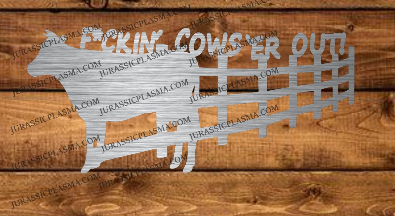 This is a digital file for a FRICKING COWS ARE OUT 17 X 8 2026 DIGITAL DOWNLOAD SVG DXF JPEG used for CNC Plasma, Laser, waterjet, or vinyl cutters, including the Cricut. The dimensions are typically in the file name. Most of our files are CNC plasma cut using fine cut consumables for fine details. Vinyl use may require editing for the size needed.