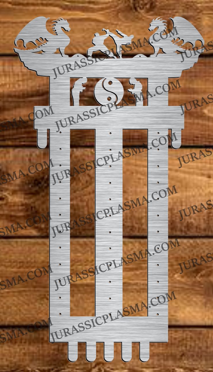 This is a digital file for a KARATE BELT HOLDER 2 DRAGON 2 22 X 40 2026 DIGITAL DOWNLOAD SVG DXF JPEG used for CNC Plasma, Laser, waterjet, or vinyl cutters, including the Cricut. The dimensions are typically in the file name. Most of our files are CNC plasma-cut using fine-cut consumables for fine details. Vinyl use may require editing to match the required size.